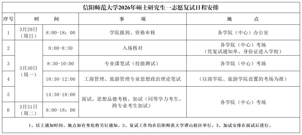 信阳师范大学2026年硕士研究生一志愿复试日程安排、资格审查地点和联系方式